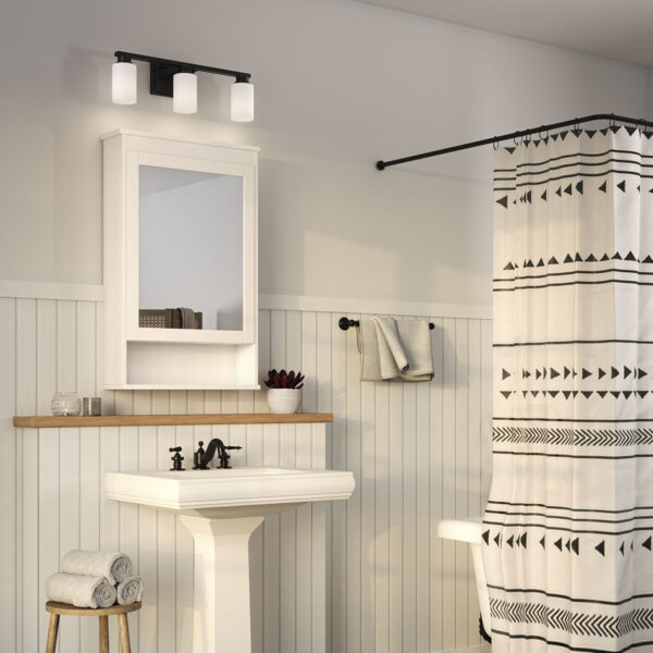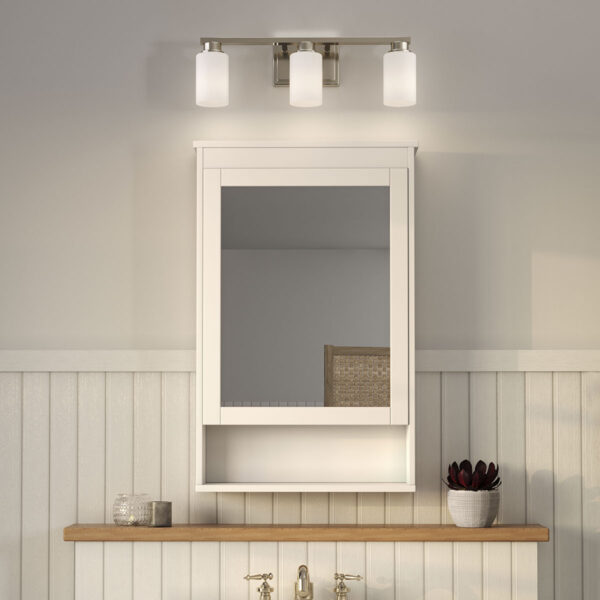 $69.99With a modern, yet timeless flair, the Avec 3-Light Zachary Vanity Light brightens your day with its elegant form. Three white, cylinder-shaped glass shades are held by a straight arm attached to a classic rectangular back plate which can be mounted up or down, increasing the light’s design flexibility. Uncluttered and simple lines depict the gracefulness of this bath vanity and add visual interest without complexity.