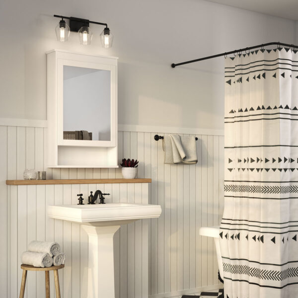 $79.99Clear shades with a softened diamond silhouette and an elegant black-toned frame brings modern appeal to the Adalyn 3-Light Vanity Light. The geometric clear glass shades deliver elegant, bright illumination to bathrooms in modern craftsman and farmhouse settings. Mount the light fixture with the glass facing up or down for more design flexibility and the proper amount of illumination so that you can easily get ready for whatever your day or evening brings.